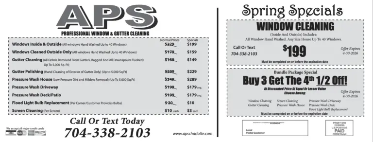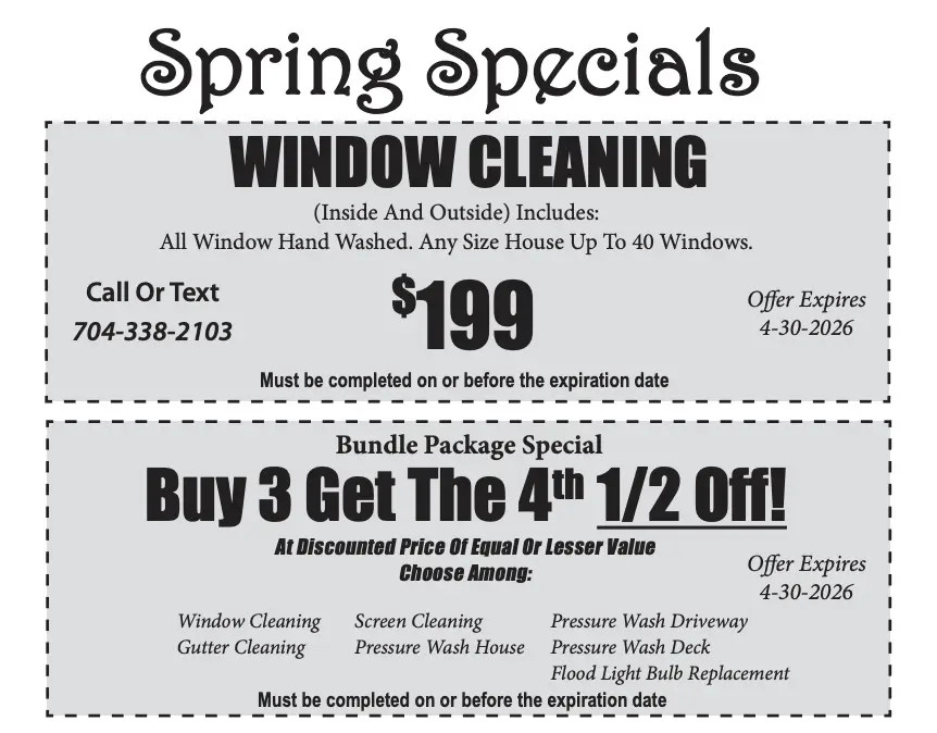 Every month, APS Window Cleaning and Gutter Cleaning and Pressure Washing offers fresh new specials designed to help Charlotte, NC homeowners save on essential home maintenance services. From discounted window cleaning to limited-time gutter cleaning and pressure washing deals, our monthly promotions make it easier and more affordable to care for your property. Based in Charlotte, NC, our experienced team delivers professional, high-quality service with every visit. Don’t miss out—our specials change monthly, so check back often to take advantage of the latest offers.